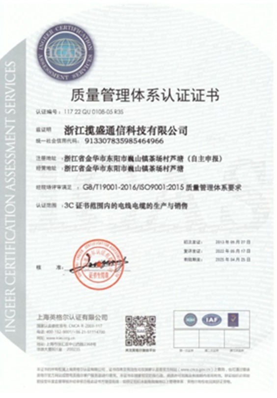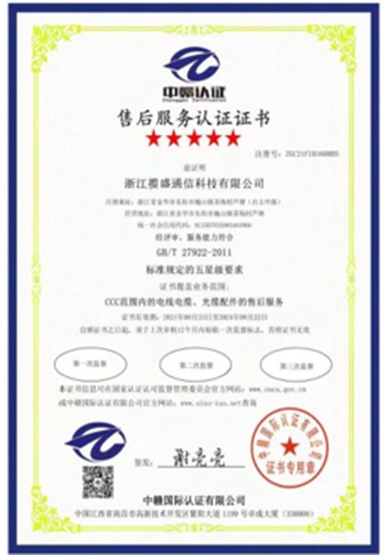 公司目前已通過3C強(qiáng)制性認(rèn)證、ISO9001質(zhì)量管理體系認(rèn)證、ISO14001環(huán)境管理體系認(rèn)證、ISO45001職業(yè)健康安全管理體系認(rèn)證、五星售后服務(wù)體系認(rèn)證、歐盟市場(chǎng)CE認(rèn)證、ROHS、REACH、FCC等證書,2015年相繼榮獲綜合布線十大品牌和傳輸設(shè)備類(安防線纜)十大品牌稱號(hào),2016年榮獲浙江省信用示范企業(yè)稱號(hào),2017年獲得浙江省科技型中小企業(yè)、東陽市誠(chéng)信品牌和誠(chéng)信民營(yíng)企業(yè)稱號(hào),2019年成為國(guó)家高新技術(shù)企業(yè)。