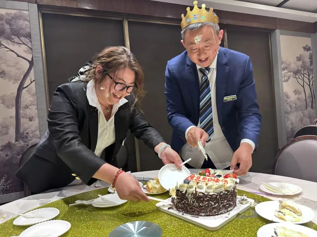 展會期間,恰逢鄭州錢立周總、河北常大偉總,云南鄢梅光總生日,公司特意為三位老總安排了生日晚宴、生日蛋糕和生日祝福。河北常大偉總的愛人發(fā)表了感言:我作為妻子還沒有考慮到,但公司給常大偉想到了,感謝公司、感謝公司領(lǐng)導(dǎo),我們必將再接再厲。我們大體能猜到常大偉許愿時的想法:共祝攬盛事業(yè)百歲壽昌。